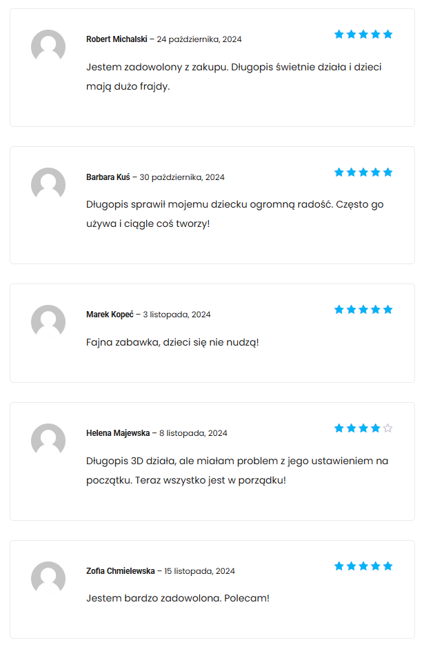 “Na początku nie byłam pewna, czy długopis 3D będzie odpowiedni dla mojego syna. Bałam się, że będzie za trudny w obsłudze. Ale kiedy spróbowaliśmy, okazał się bardzo prosty! Mój syn tworzy niesamowite rzeczy. Polecam!”